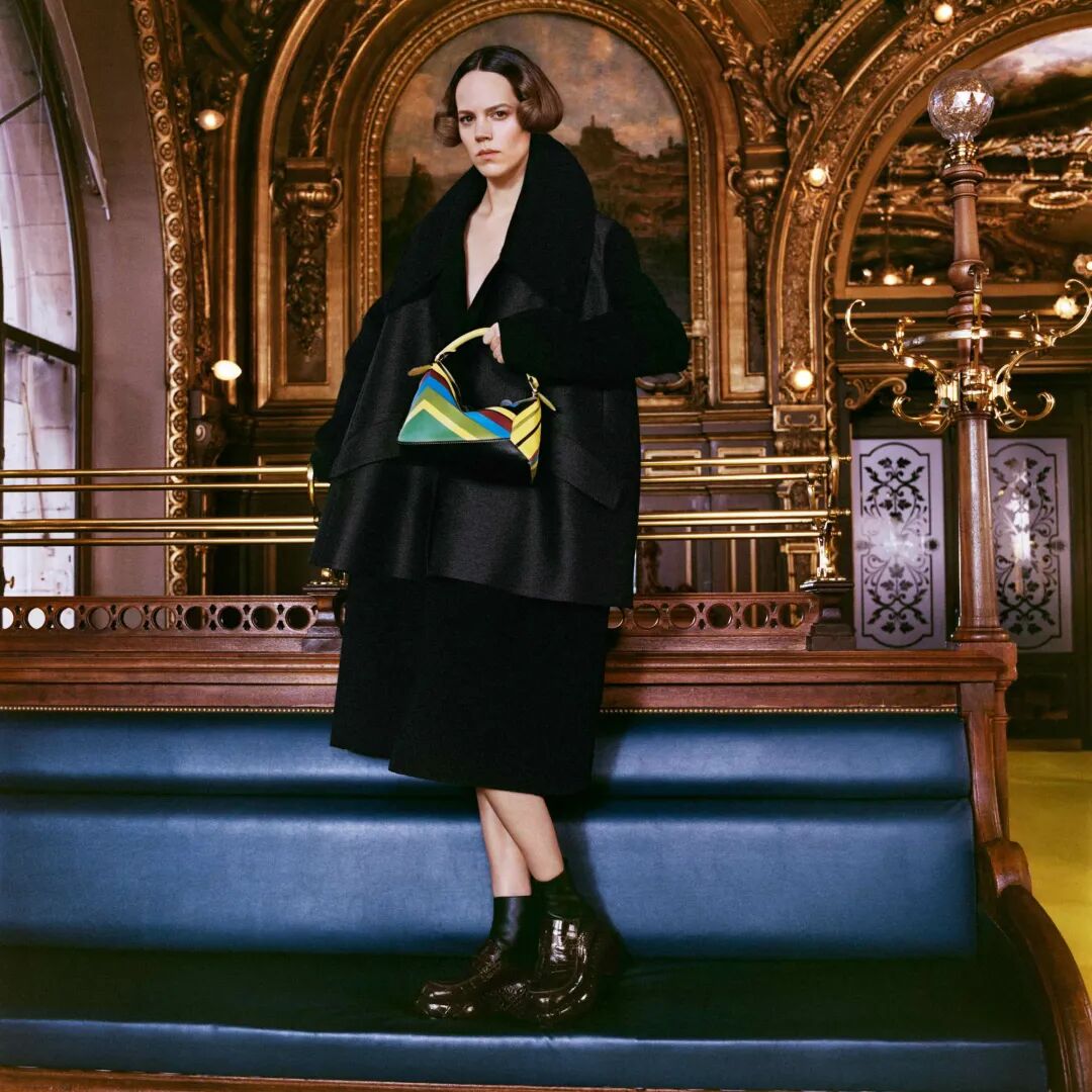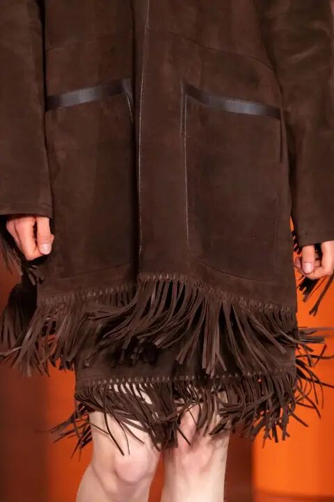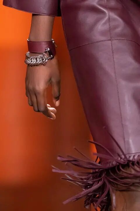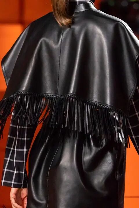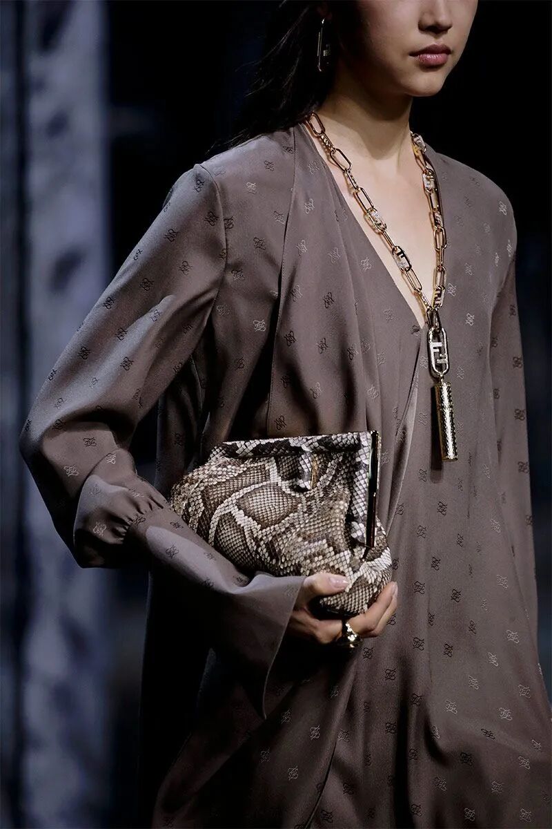 作为FENDI品牌DNA的皮草和皮革依然是本季的重头戏。对比鲜明的人字纹搭配重量感和体积感兼具的长流苏皮草短大衣、水洗的大廓形水貂大衣、蛇纹皮革和棕色皮毛拼接的外套、钟形袖短外套、镂空的麂皮风衣等等,为皮草带来一种建筑性的美感,充满了空间性和雕塑感。其中最为华丽的服装原材料回收自以前的作品,是一只长毛狐狸的皮毛,由工匠重新升级后所得,探索了可持续时尚。