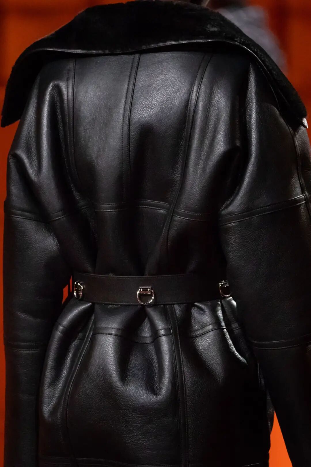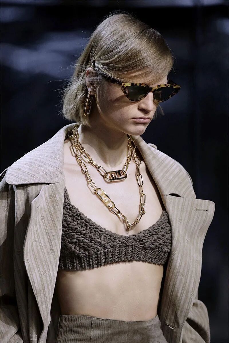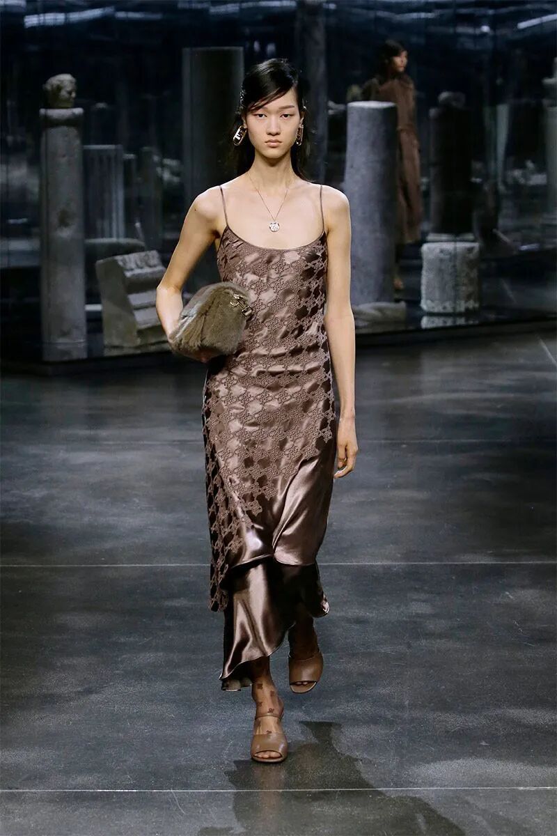 作为FENDI品牌DNA的皮草和皮革依然是本季的重头戏。对比鲜明的人字纹搭配重量感和体积感兼具的长流苏皮草短大衣、水洗的大廓形水貂大衣、蛇纹皮革和棕色皮毛拼接的外套、钟形袖短外套、镂空的麂皮风衣等等,为皮草带来一种建筑性的美感,充满了空间性和雕塑感。其中最为华丽的服装原材料回收自以前的作品,是一只长毛狐狸的皮毛,由工匠重新升级后所得,探索了可持续时尚。