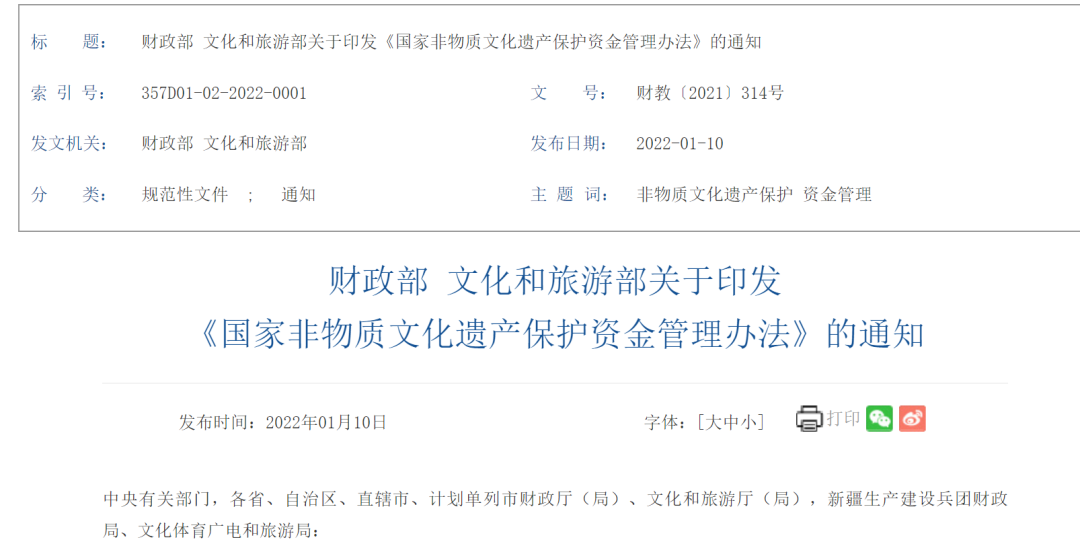 近日,财政部、文化和旅游部联合印发《国家非物质文化遗产保护资金管理办法》,进一步...