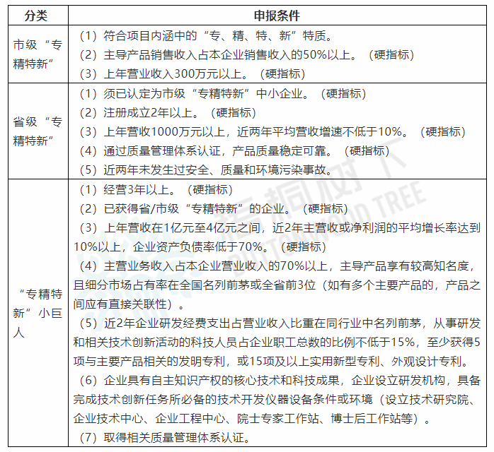 具体来说,国家及各省市“专精特新”企业申报条件如下文所示: