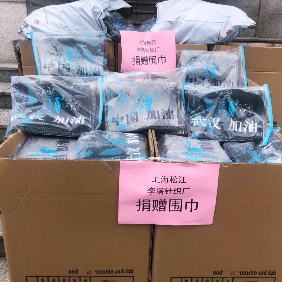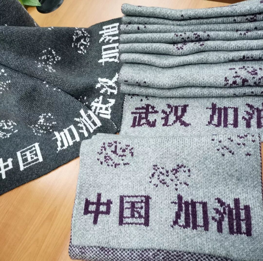 当天夜晚,她怎么也睡不着,翻来覆去想着:“自己捐的量不够各道口的志愿者全用上,不够社区里夜晚还要奔波的志愿者都围上。”坚定信念的她立即掀开被子,开始画设计图,本应出口的厚纱,被她翻找出来,她思索着:“这个茸度、这个厚度正正好!”第二天,工厂里热闹起来,被打电话叫回来的20余名工人加班加点的排版、摇纱, 一条条织着“武汉加油!中国加油!”的各色围巾出产。