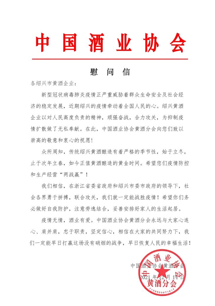 / 携手同心·众志成城——中国酒业协会黄酒分会致绍兴黄酒企业的慰问信