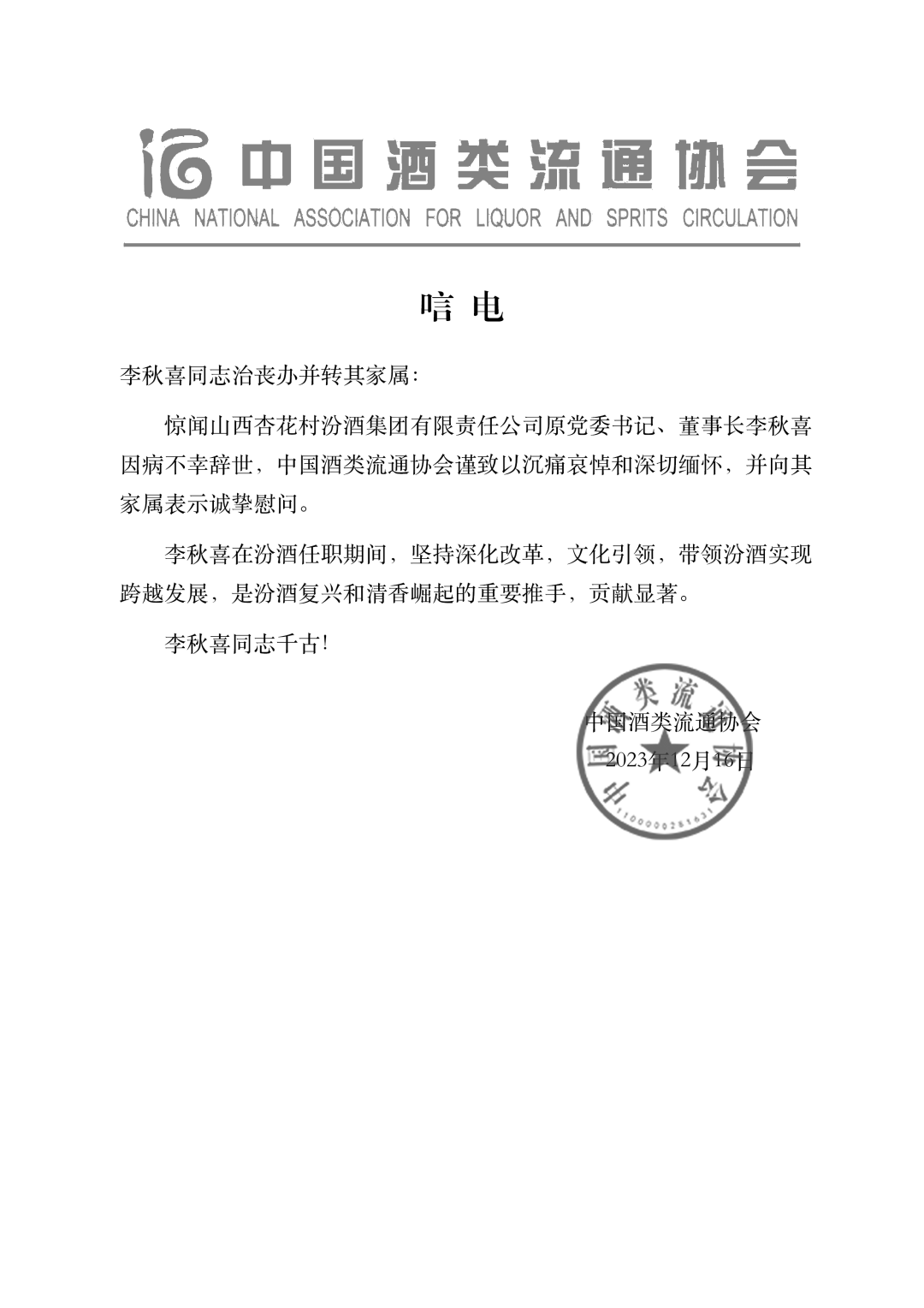 中国酒类流通协会发唁电沉痛悼念李秋喜先生