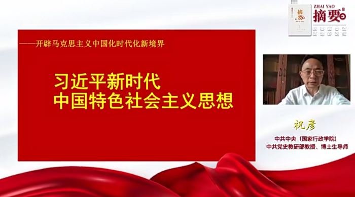 习近平新时代中国特色社会主义思想是中华文化和中国精神的时代精华,是实现中华民族伟大复兴的行动指南。此期课程邀请来自中共中央党校中共党史教研部教授、博士生导师祝彦,为大家专题讲授《习近平新时代中国特色社会主义思想》。祝教授从三个问题出发:为什么要学理论?怎样学理论?从理论中要学到什么进行探讨,从理论创建的时代背景、丰富内涵、理论贡献、实践成就等方面进行深度解读,帮助我们把握好正确的世界观和方法论,更好的理解习近平新时代中国特色社会主义思想这一最新的马克思主义中国化理论成果。