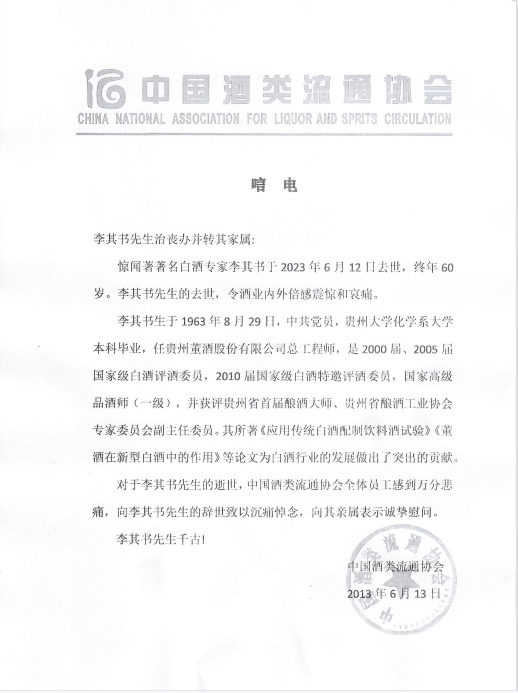 中国酒类流通协会发唁电沉痛悼念李其书先生