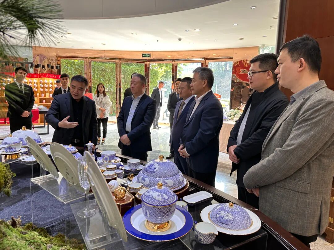 中酒协理事长宋书玉一行参观国瓷永丰源文化成果展厅,国瓷永丰源董事长刘权辉亲自为大家讲解、分享每一款产品的品牌出处、文化立意、使用定位和背后延伸的故事。国瓷永丰源以瓷器为载体,通过对表现品牌鞭辟入里地理解,结合传承技艺、革新创意、科技赋能,将原本停留在平面的描述,以脱胎换骨的形象将其具化。每一款产品,既是器皿,也是文化,更是国瓷永丰源人对每一位使用者送去的最祥瑞的祝福!