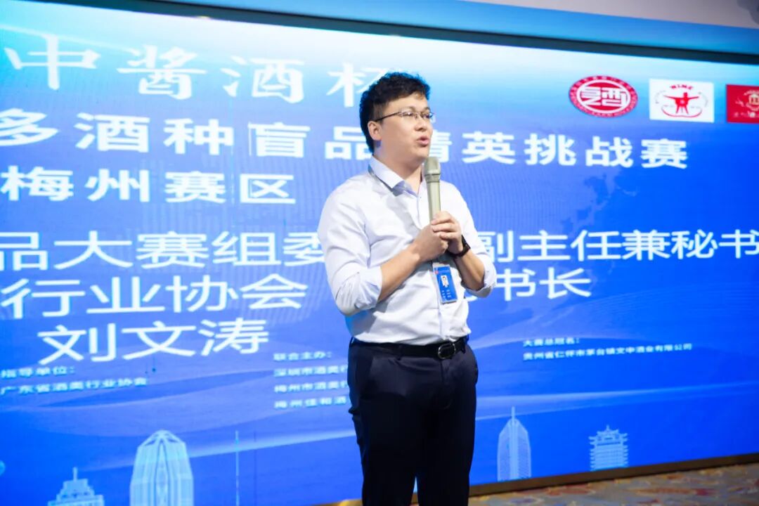 2022大湾区多酒种盲品大赛组委会副主任兼秘书长、深圳市酒类行业协会副秘书长刘文涛上台致辞,对梅州大赛的情况进行总结,并且感谢梅州酒协、佳和酒道、金达贸易以及梅州全体选手们的大力支持。