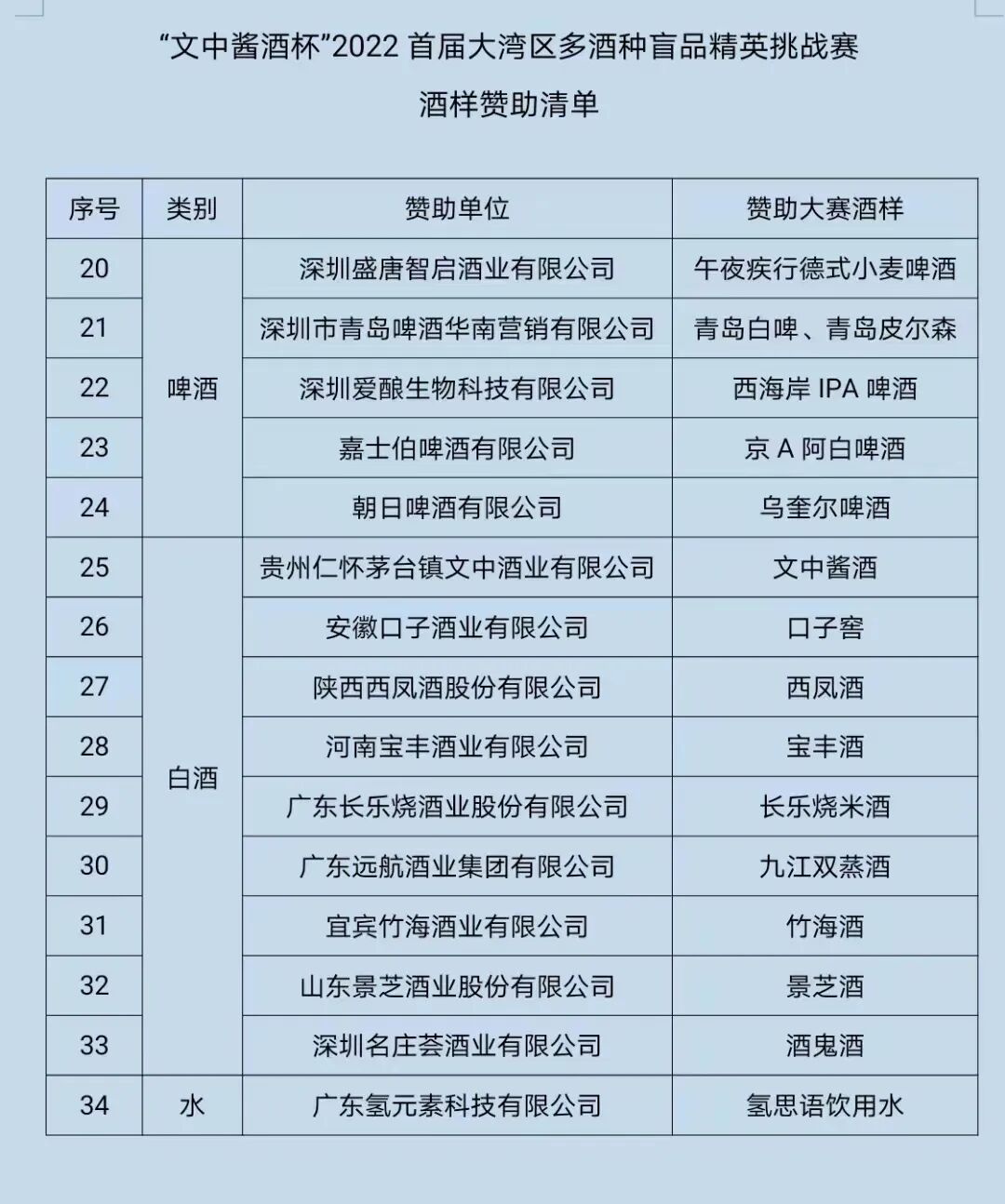 同时,大赛酒样得到了文中酱酒、宜宾竹海、宝丰酒、广东长乐烧、广东醉之仙酒业、口子窖、毛铺苦荞酒、椰岛鹿龟酒、泸州老窖绿豆大曲、发现者、弗利欧、智猴、开普山、千裕果酒、凯缘春蓝莓酒、同林桑葚酒、嘉士伯、朝日啤酒、爱酿啤酒以及大赛用水:广东氢元素科技的大力支持。(详见文后名单)