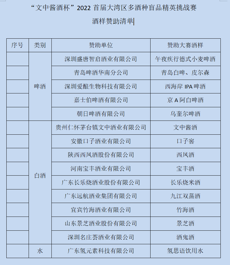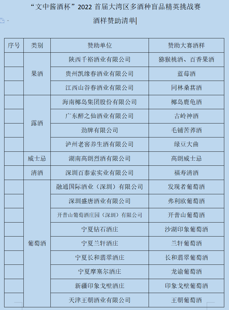 同时,大赛酒样得到了文中酱酒、宜宾竹海、宝丰酒、广东长乐烧、广东醉之仙酒业、口子窖、毛铺苦荞酒、椰岛鹿龟酒、泸州老窖绿豆大曲、发现者、弗利欧、智猴、开普山、千裕果酒、凯缘春蓝莓酒、同林桑葚酒、嘉士伯、朝日啤酒、爱酿啤酒以及大赛用水广东氢元素科技的大力支持。(详见文后名单)