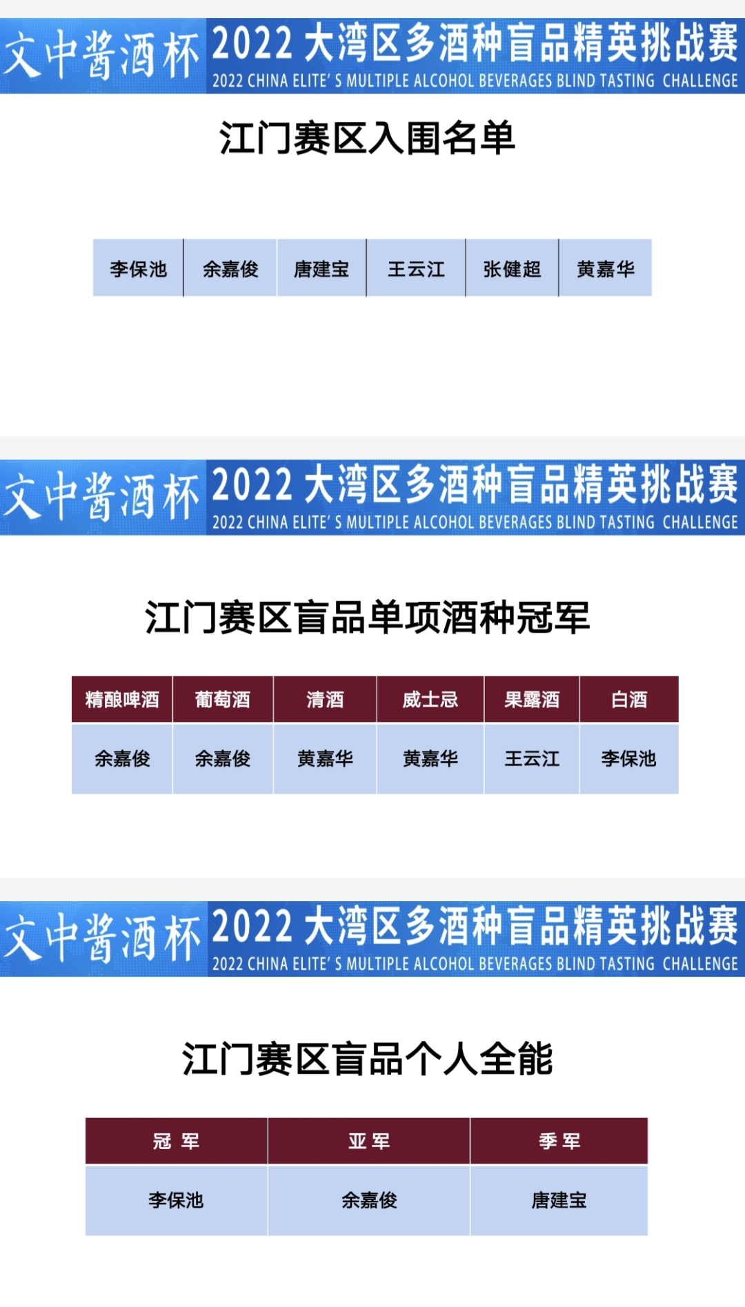 经过四个小时、六个酒种、八个轮次、合计46杯酒的盲品、江门赛区一共评选出6名选手入围总决赛,包含六个单项酒种冠军、个人全能冠、亚、季军。