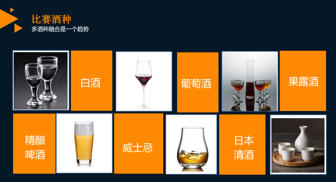 3、总决赛团体赛(团体盲品全能赛):4人/队,以队为单位,共同完成6个酒种盲品:每个酒种一轮次,一个题目。