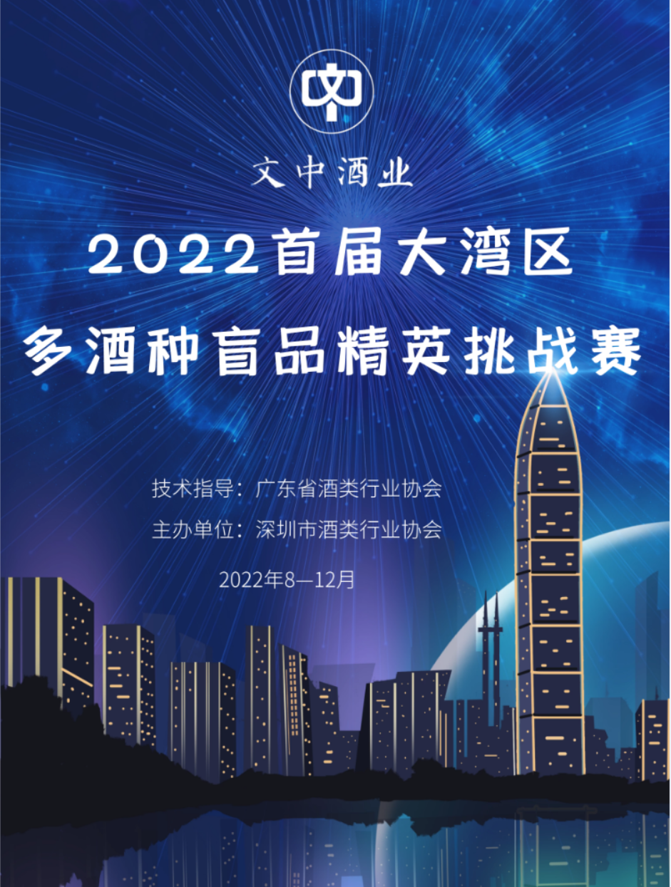 由广东省酒类行业协会技术指导,深圳市酒类行业协会主办,广州、深圳、佛山、东莞、中山、珠海、惠州、江门、梅州、潮汕片区、粤西片区等11个地市酒类行业协会联合协办的“‘文中酱酒杯’2022首届大湾区多酒种盲品城市挑战赛”将于2022年8-11月期间,在深圳等11个城市开赛,其中港澳选手并入深圳区。
