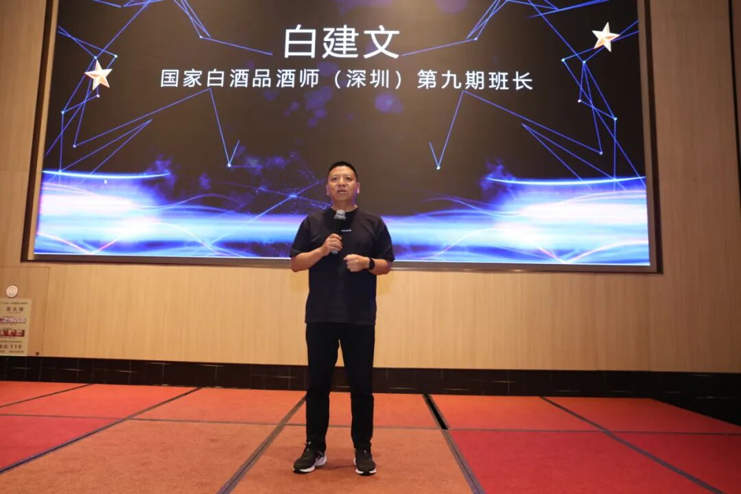 国家白酒品酒师(深圳)九期班长白建文发言表示,首先祝贺十期班的师弟师妹们获得品酒师证书,一起分享学习的快乐,并介绍了茅台镇酱酒产区的一些最新情况,同时欢迎所有同学们一起做客参观酱河酒庄。