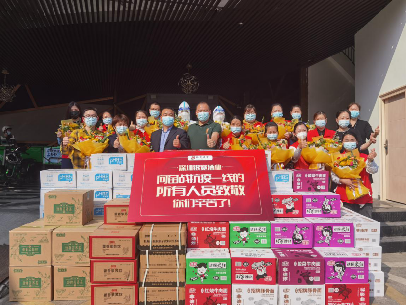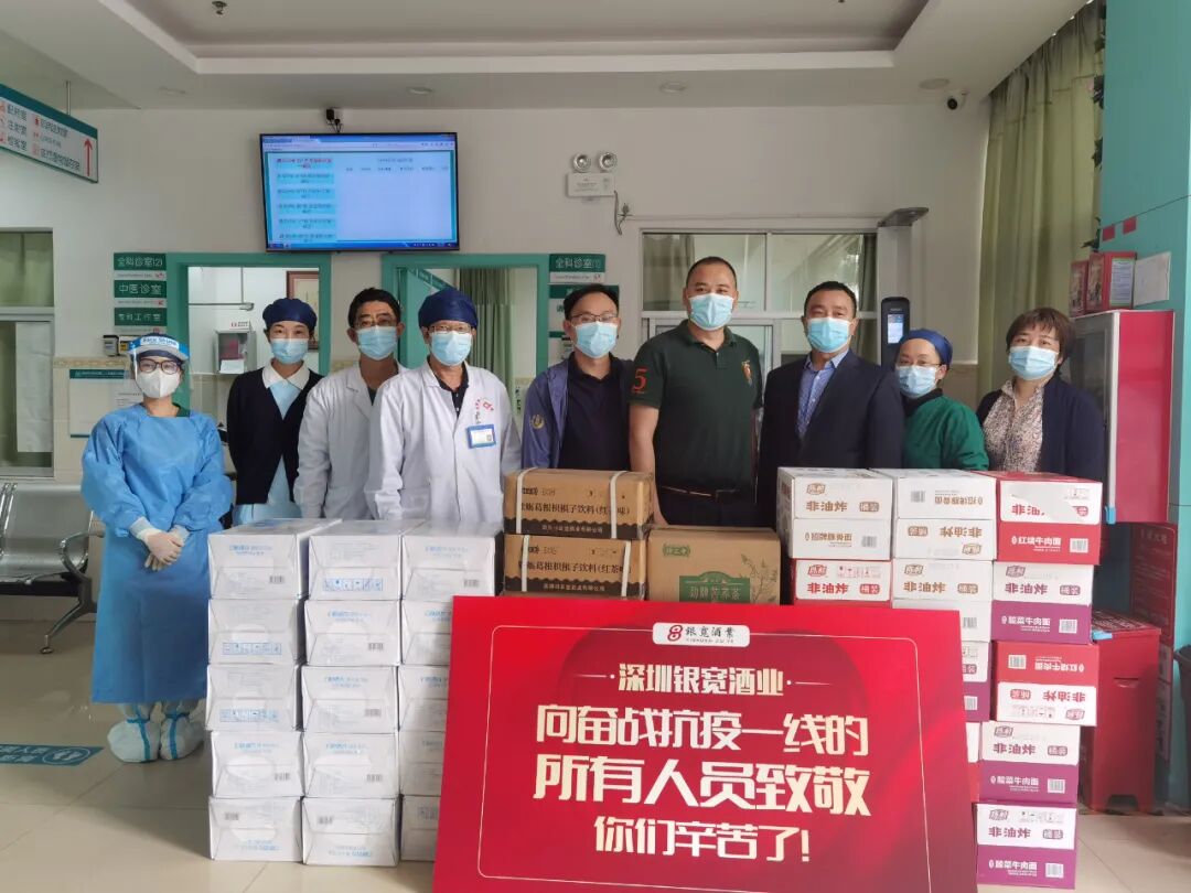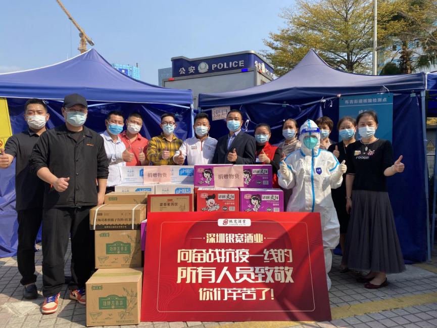 2022年3月4日,深圳市酒类行业协会执行会长单位——深圳市银宽酒业有限公司(以下简称“银宽酒业”),安排工作组分别前往文景社区工作站、文景社康中心、布吉天虹核酸检测点,向奋战在防疫一线的全体工作人员送去矿泉水、保健品、健康食品和保健饮料等生活物资,并转达公司的慰问和感谢。
