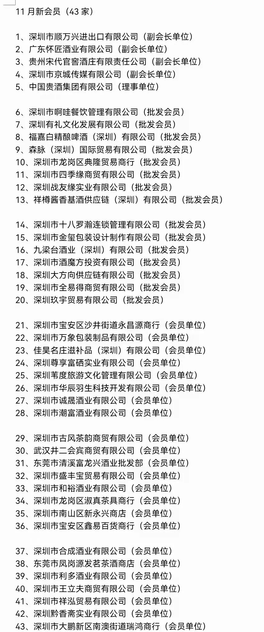在广大酒业同仁的支持和信任下,11月共43家酒类企业加入了深圳酒类行业协会,正式成为深圳酒协大家庭的一员。深圳市酒类行业协会对各位新会员的加入表示热烈欢迎。刘文涛副秘书长对协会的历程、架构、服务项目、发展方向对新会员们做了介绍,同时对酒协与会员之间“互相学习交流,平台资源共享”的发展思想进行了论述和分享。深圳酒协始终坚信,多元化发展、精准化服务始终是协会坚守的服务策略和思想,要在“求同存异”的基础上碰出想法、擦出火花、做出实效才是深圳酒协服务酒类行业企业的最终目的。只有整个行业进入了良好发展的阶段,行业发展壮大了,口碑好了,品牌树立了,需求扩大了,每位酒行业里面的企业才有更好的发展空间。