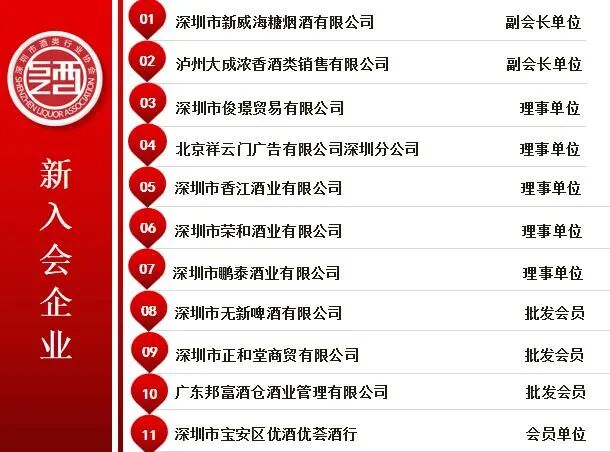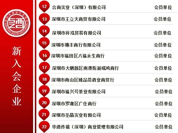在广大酒业同仁的支持和信任下,10月共22家酒类企业加入了深圳酒类行业协会,正式成为深圳酒协大家庭的一员。深圳市酒类行业协会对各位新会员的加入表示热烈欢迎。刘文涛副秘书长对协会的历程、架构、服务项目、发展方向对新会员们做了介绍,同时对酒协与会员之间“互相学习交流,平台资源共享”的发展思想进行了论述和分享。深圳酒协始终坚信,多元化发展、精准化服务始终是协会坚守的服务策略和思想,要在“求同存异”的基础上碰出想法、擦出火花、做出实效才是深圳酒协服务酒类行业企业的最终目的。只有整个行业进入了良好发展的阶段,行业发展壮大了,口碑好了,品牌树立了,需求扩大了,每位酒行业里面的企业才有更好的发展空间。