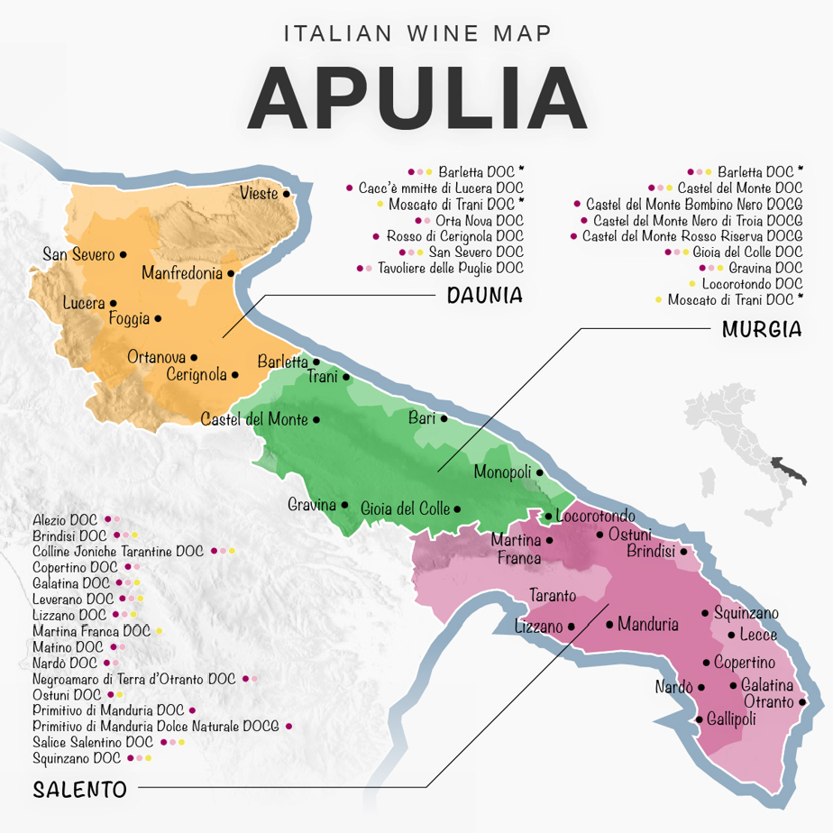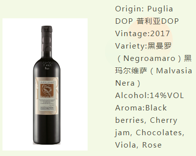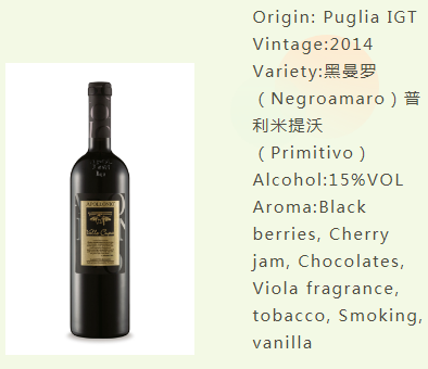 红葡萄品种:黑曼罗(Negroamaro)、普里米蒂沃(Primitivo)、黑玛尔维萨(Malvasia Nera)