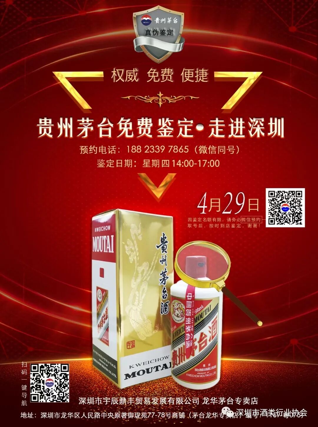 深圳市龙华区人民路中央原著御珑苑77-78号商铺 贵州茅台专卖店 编号:1169 粤075(识别海报中二维码可一键导航)