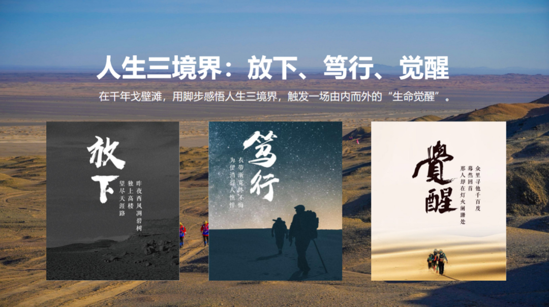 远离城市喧嚣,在荒凉大漠、风沙走石中,用脚步挑战自我,突破身心极限……这是一次与自我的深度对话,是一次对旧我的突破与超越,是大自然赋予我们新生的重要一课。