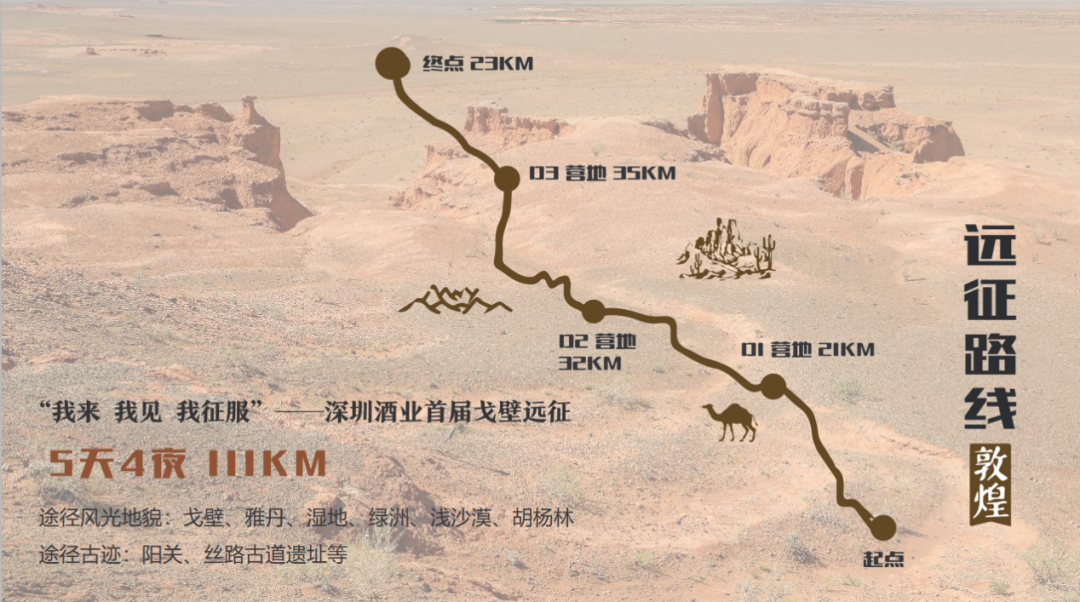 “我来,我见,我征服!”深圳酒业首届戈壁远征活动是深圳市酒类行业首次精心打造的集体户外IP活动。本活动汇聚深圳酒业产业链不同层级、深圳酒类市场不同角色、深圳酒协全面资源,旨在为深圳酒类行业提供一个文化输出、品牌输出、资源输出、效益输出的具有特色的资源整合服务提升平台。