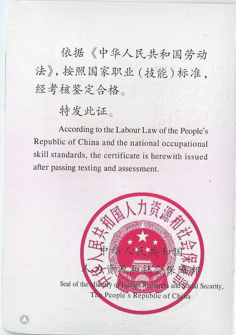 考试通过后,颁发《中华人民共和国职业资格证书》