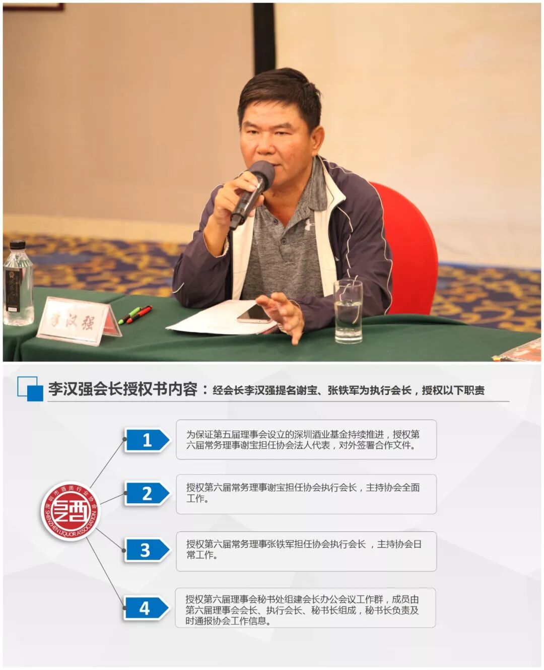 会上首先由李汉强会长宣布执行会长职责,授权第六届常务理事谢宝和张铁军担任协会执行会长,主持协会工作。将常委理事按深圳酒业基金项目、酒产业文化园项目、酒厂酒庄体验之旅项目、职业培训项目四个项目分工,并明确了各自的责任范围。