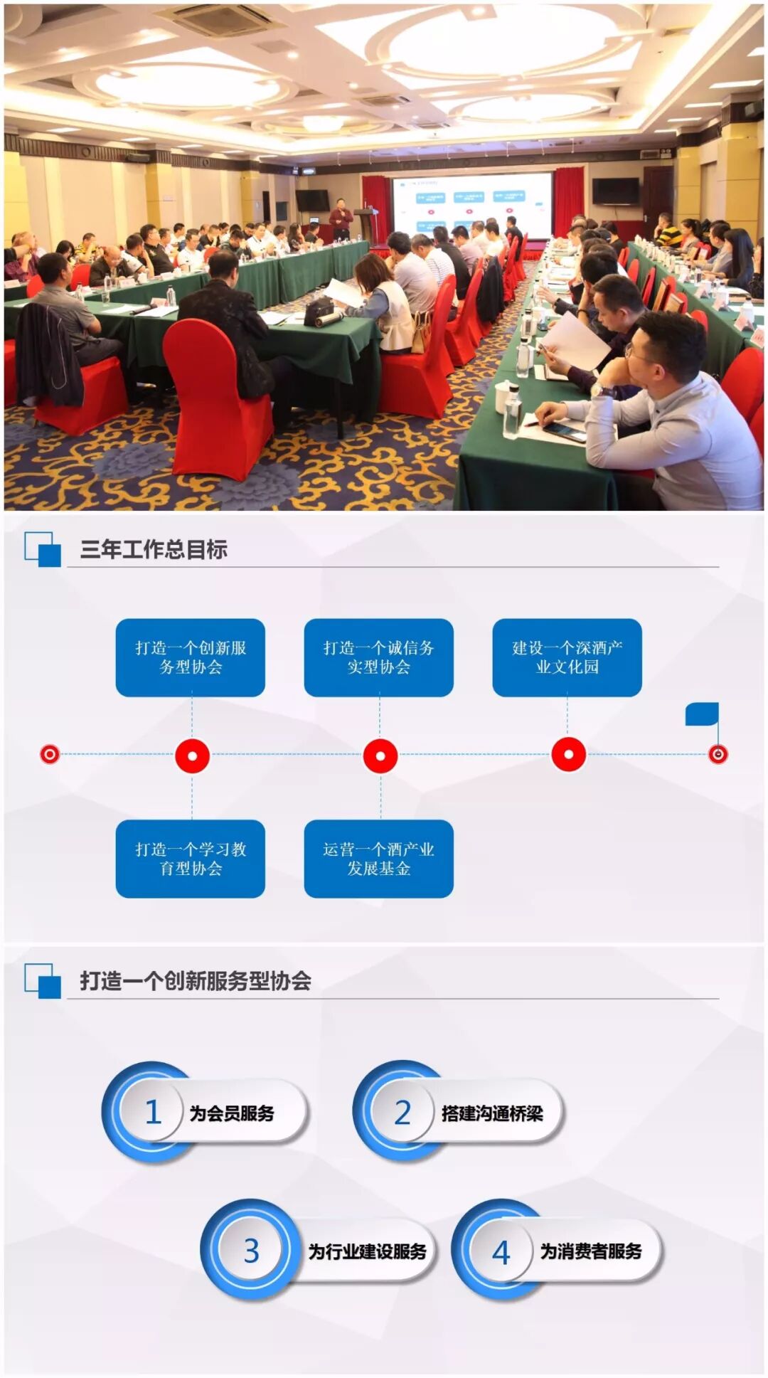 由酒协杨克建秘书长介绍了酒协的三年工作计划,明确了三年“五个一”工作总目标:打造一个创新服务型协会、打造一个学习教育型协会、打造一个诚信务实型协会、运营一只酒产业发展基金、建设一个深酒产业文化园。努力做好为会员服务,搭建与政府沟通桥梁,为行业建设服务,为消费者服务。