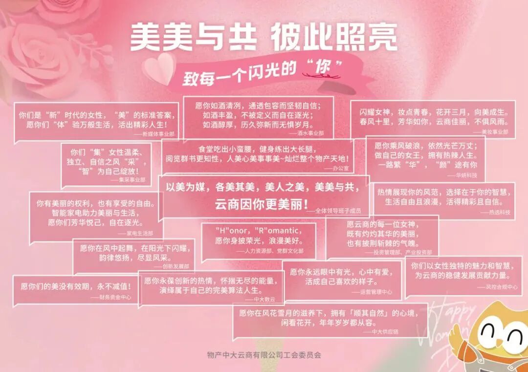 云商工会还在全公司征集了给女神们的祝福,每句赞美都“独宠”于每一个“她”!愿她们保持初心、笃信勤善,愿她们昂首阔步、携手并进,一路繁花似锦,传递更多美好,共同创造云商公司更加绚丽多彩的明天。
