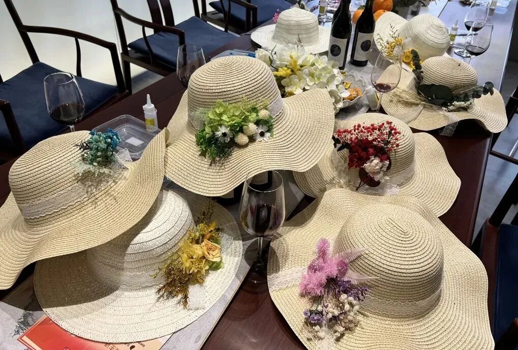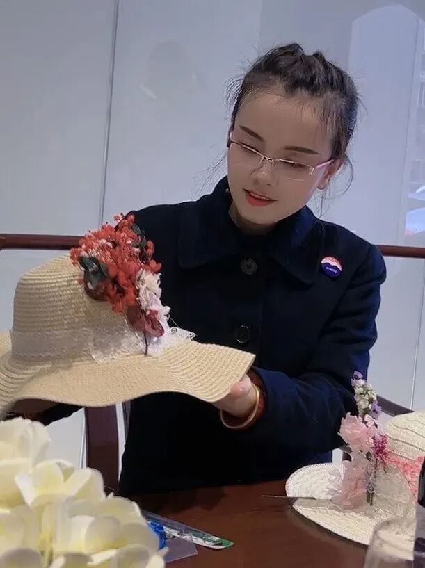 工艺老师从花材、配色和技巧等方面生动地为大家讲解了制作要点,大家细致地修剪花枝、亲自动手搭配花束,用充满春天柔美色彩的鲜花饰于法式田园遮阳帽上,设计属于自己的春日风景,为自己送上一份节日的祝福。