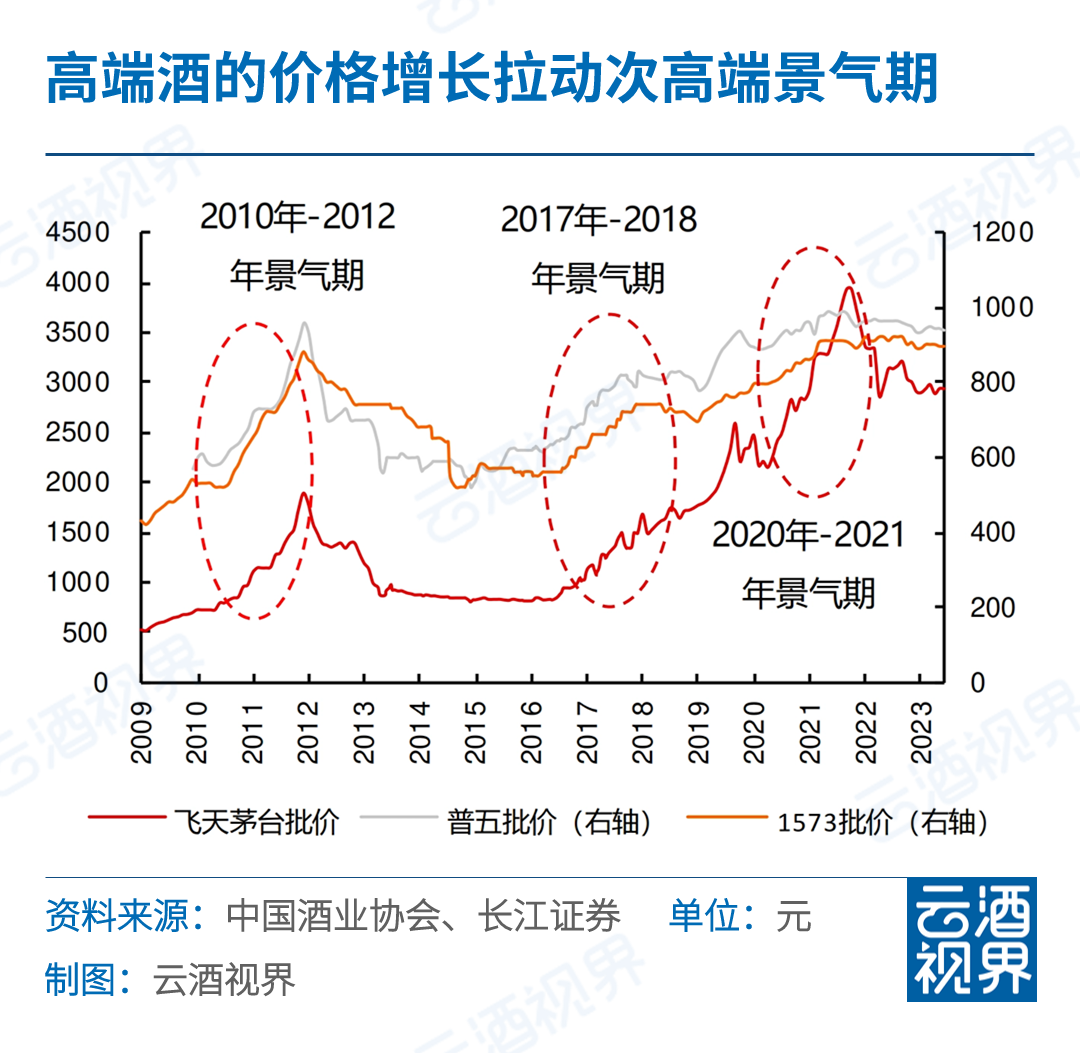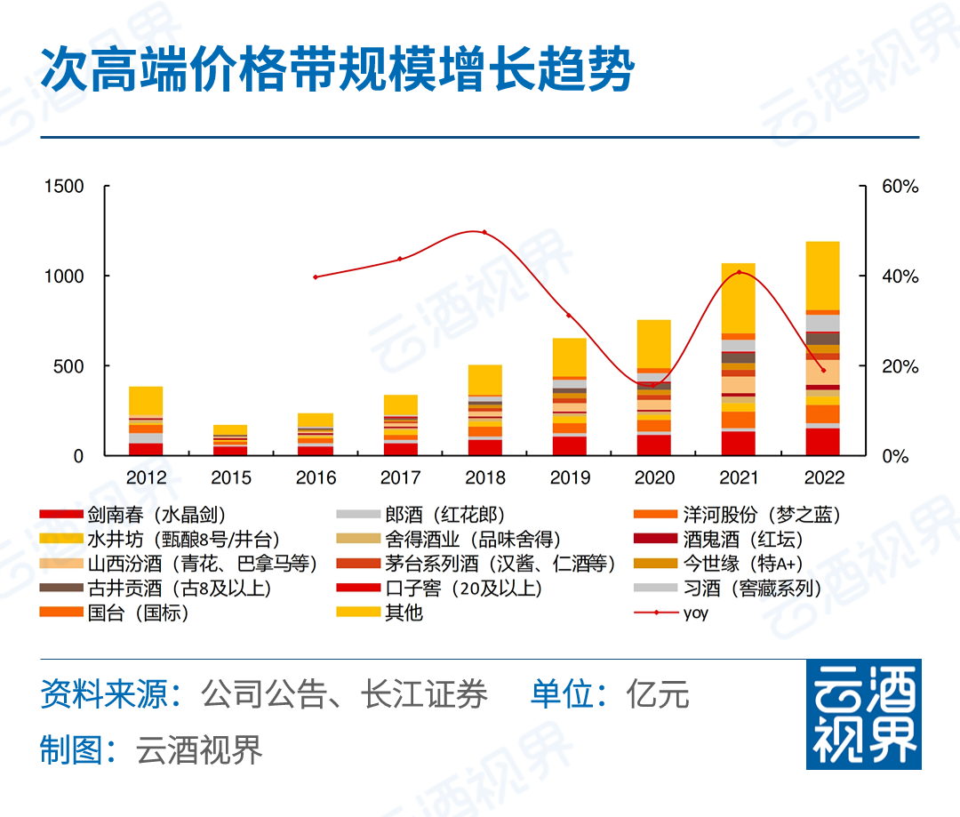 国海证券研报表示,次高端分化出300-500元和600-800元两个价位段,未来格局变化将以这两个价位段为主,企业对于600元以上价位段的把控能力,或许能直接赋能于400元+产品。