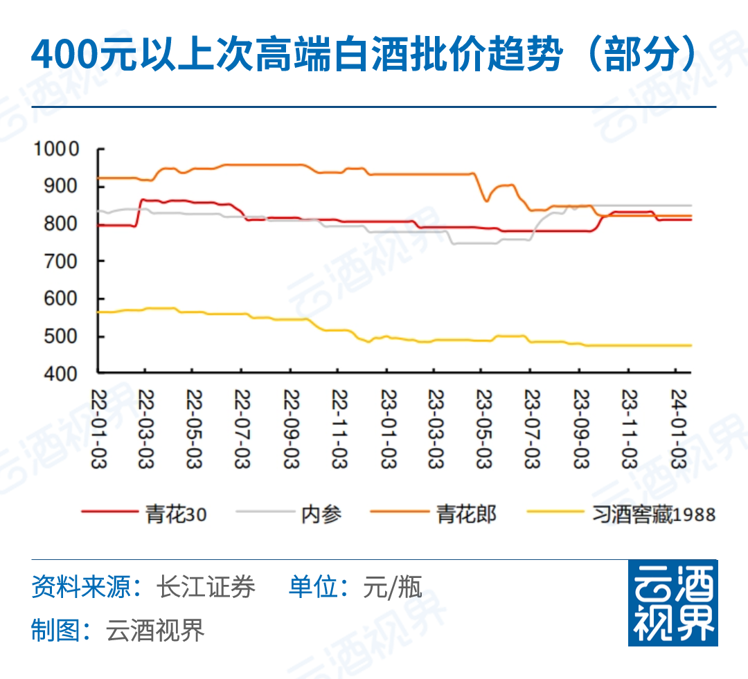 也有酒商提出,600-800元次高端白酒,消费群体以中小企业为主,抗风险能力相对有限,商务宴请可能用300-400元名酒替代。另外,由于2023年市场出现价格倒挂,平台百亿补贴等现象和利好,大单品君品习酒、金沙摘要、习酒1988、国台国标等产品的实际成交价都有一定调整,600-800元次高端白酒承受压力较大。