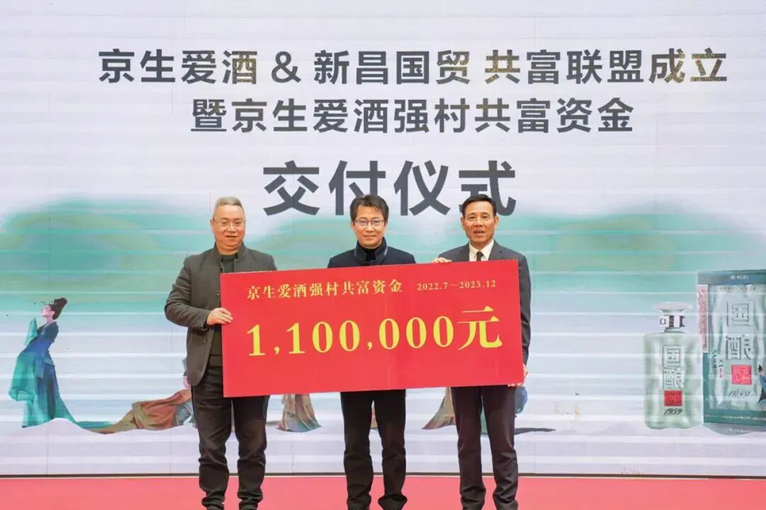 活动现场,绍兴黄酒集团(古越龙山)党委副书记杨文龙、新昌国贸实业有限公司董事长潘若平、新昌县七星街道党工委书记俞均坪进行京生爱酒&新昌国贸共富联盟成立暨京生爱酒强村共富资金交付仪式,共同为村企共富按下“加速键”。