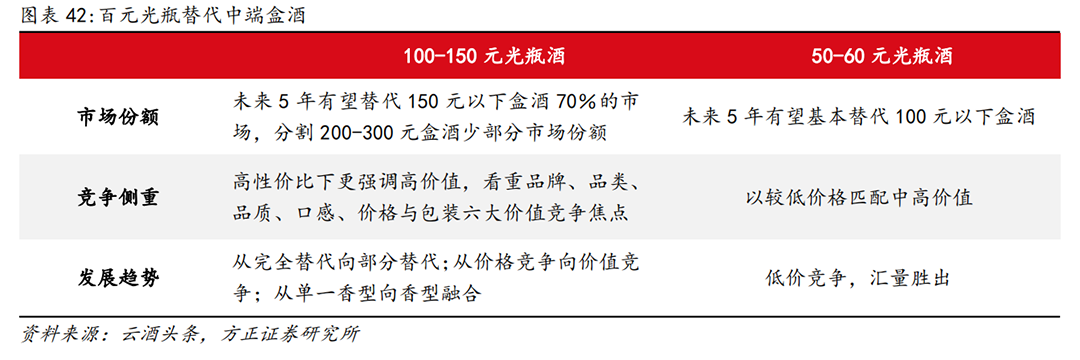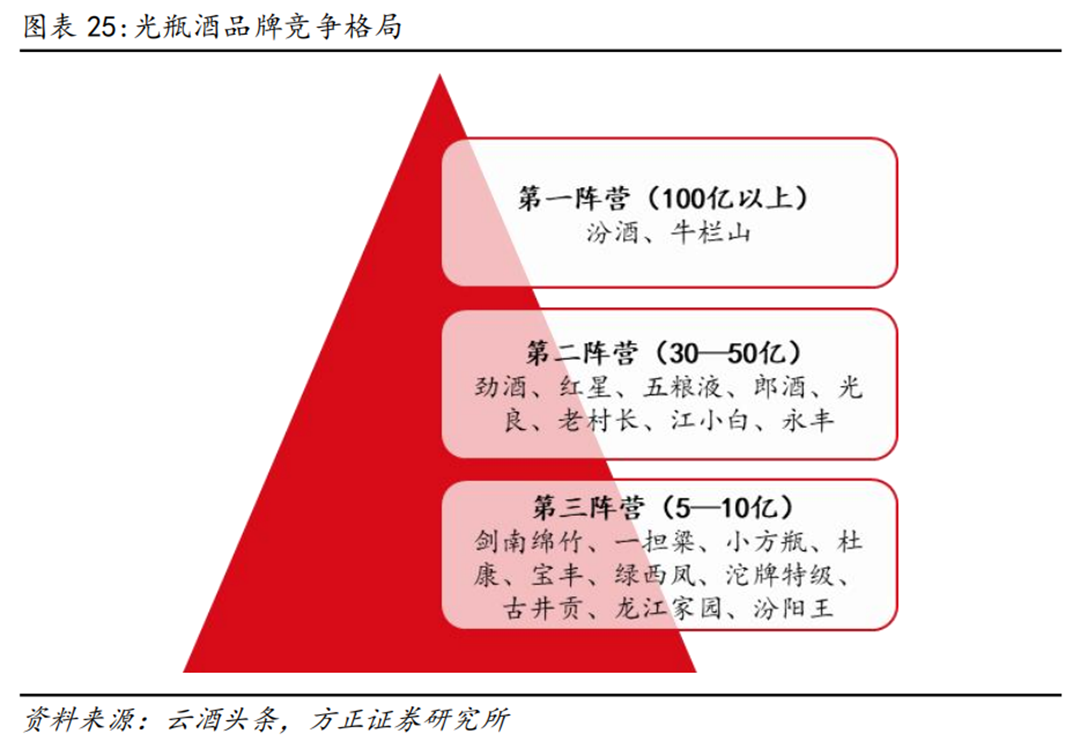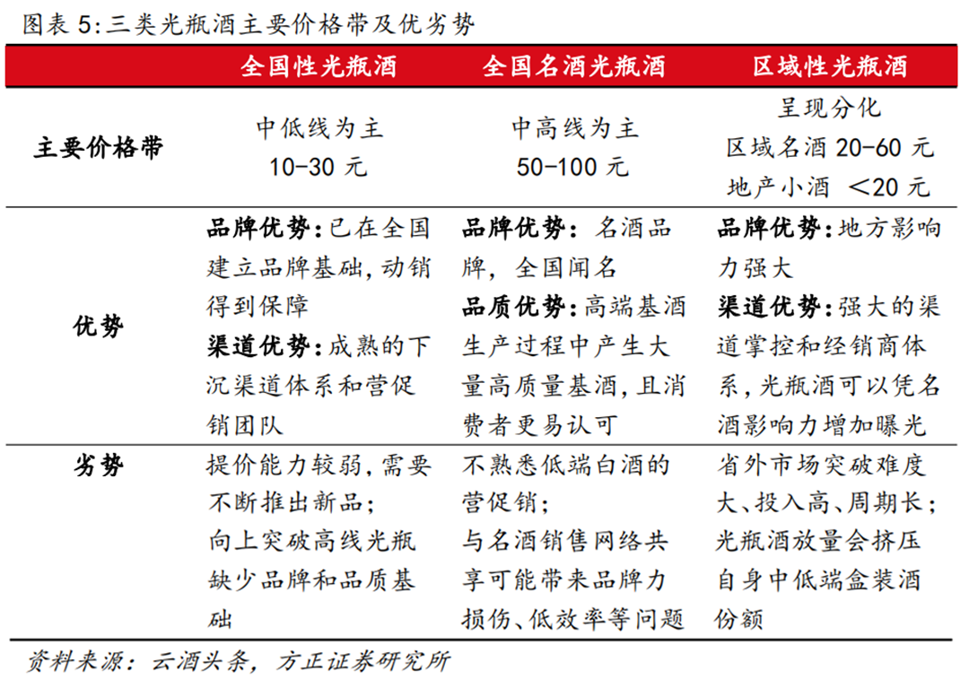 全国性光瓶酒:在大众价位具有广泛的品牌认知,发展底盘预计保持稳固,但在光瓶酒升级的趋势下可能面临品牌认知低端、向上升级动力不足的问题,预计仅少量龙头能够借助渠道力量,顺利完成产品结构升级,从而在全国市场占据一定份额。