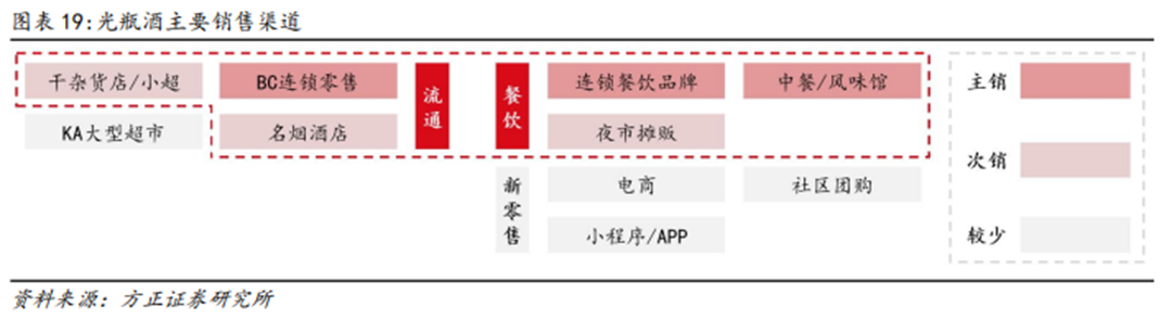 从渠道结构看,光瓶销售以传统形态为主,零售、餐饮连锁终端驱动力强。面向渠道,光瓶酒以走量为主,因此连锁零售、连锁餐饮、中餐馆均为光瓶酒主销渠道,餐饮渠道约占光瓶酒整体销售场景的30-40%。