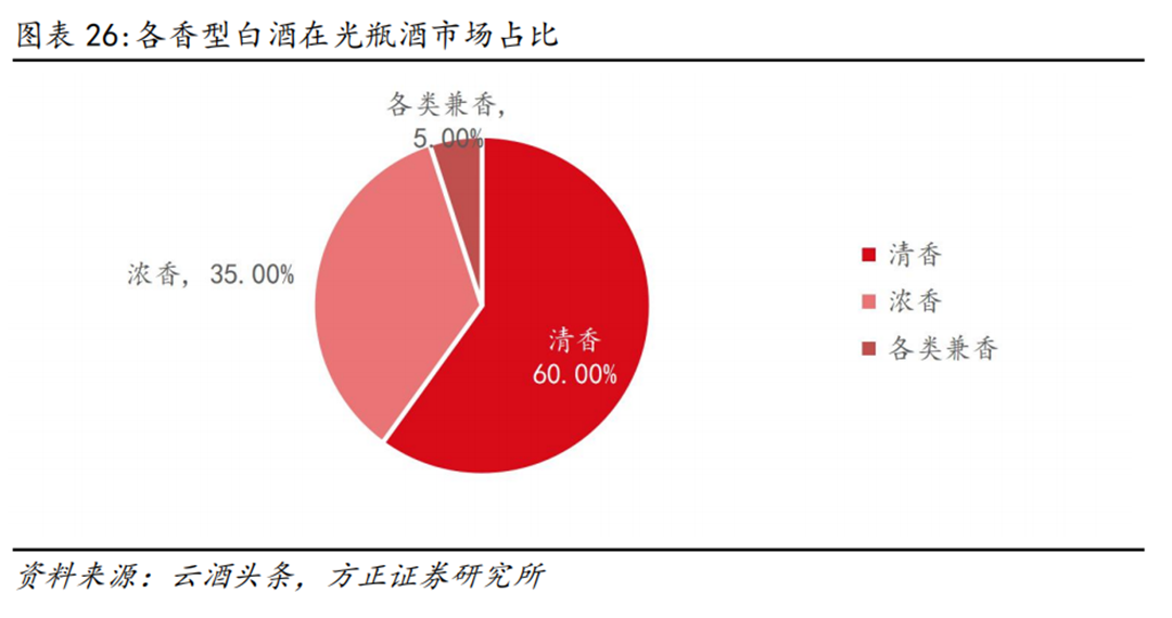如果以香型为分类指标,在光瓶酒市场,清香品类依然占主导地位,主要包括汾酒、红星、牛栏山、永丰、宝丰、老白干、黄鹤楼等,其规模占总体的60%;浓香位居第二,占比35%;各类兼香品类占比5%,约50亿元。