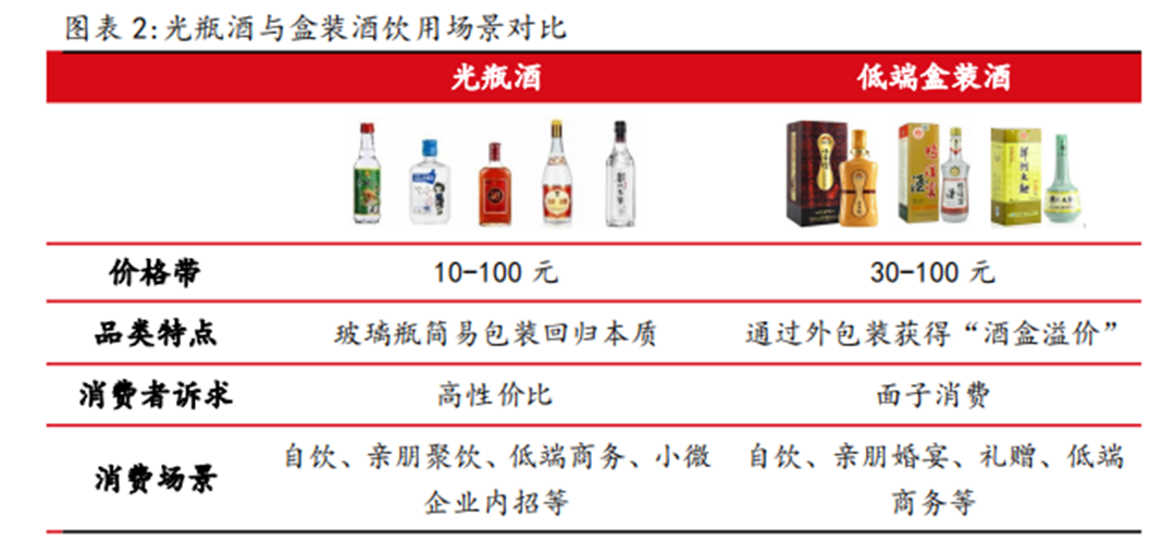 光瓶酒具有价格亲民、渠道便利、高频消费的特点,对于大众消费而言具备一定的刚需属性。而随着白酒消费回归理性,更具性价比的光瓶酒,有望进一步替代低端盒装酒。