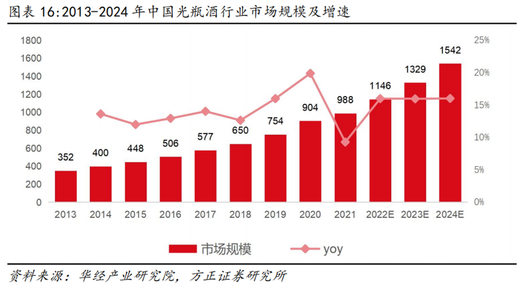 目前,白酒行业规模为6000亿元,中低端酒的规模合计近4000亿元,占据较大的市场空间,其中,光瓶酒自2013年驶入快车道,预计2022-2024年仍将保持16%的年增长速度,2024年市场规模或将超过1500亿元。
