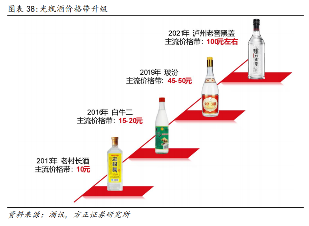 从2013年以老村长酒为代表的10元价位、2016年以白牛二为代表的15-20元价位、2019年以玻汾为代表的45-50元价位到2021年以泸州老窖黑盖为代表的100元价位,光瓶酒价格天花板不断被打破,价格带也从曾经的低端价位带向全价位带发展,形成10-30元的大众消费段、30-60元的提升价位段、60-100元的高端价位段。