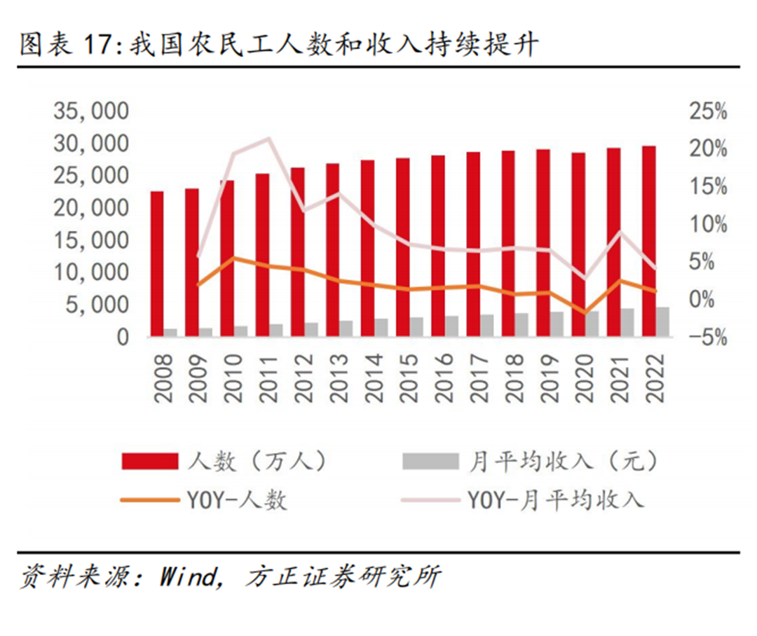 从主力消费人群构成看,农民工是光瓶酒基础消费客群,并将长期为光瓶酒消费贡献核心需求。农民工人数、月均收入稳定提升,近年来人数增速基本处于1%-2%区间,收入增速基本处于5%-7%区间。