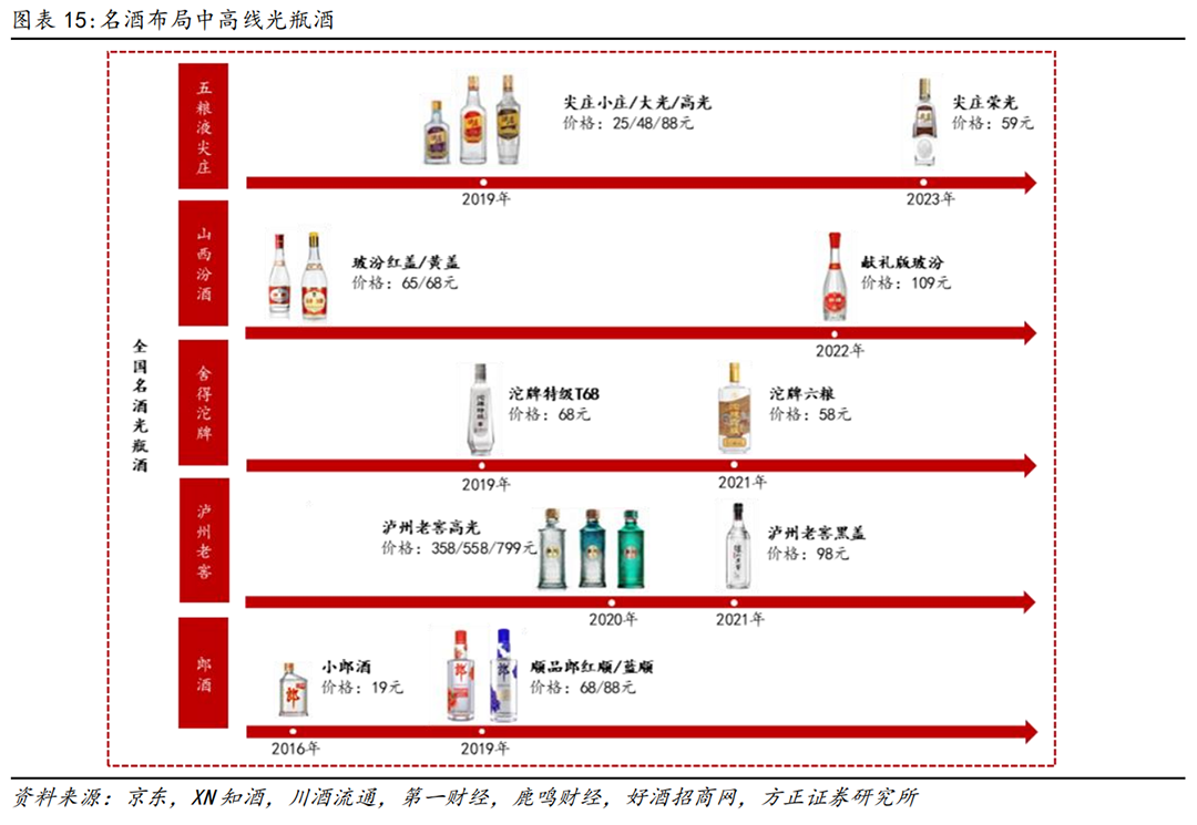 全国名酒光瓶酒:全国名酒的光瓶酒品牌或产品,以玻汾、五粮液尖庄、郎酒顺品郎为代表,具有名酒基因、高知名度和高品质背书,且具有覆盖全国的强大分销网络支撑,过去在全国名酒战略中处于边缘化状态,近年来在玻汾的带领下,名酒纷纷推出光瓶酒战略和大单品,主要覆盖50-100元。