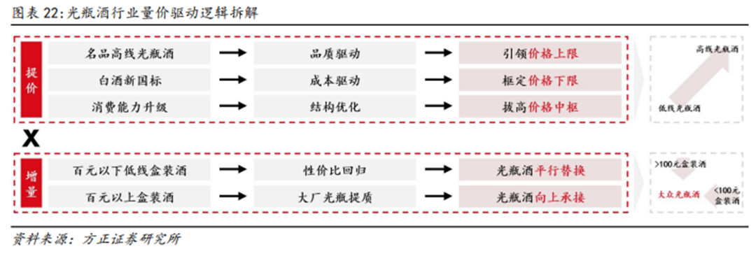 在新国标引领、居民消费理念升级的环境下,光瓶酒价格上下限逐步抬升,低线光瓶向高线光瓶升级趋势渐长。同时,百元以下盒装酒在成本劣势下逐步被性价比更高的光瓶酒替换,百元以上盒装酒需求由大厂高质量光瓶酒承接,量价双击驱动未来光瓶酒行业扩容。
