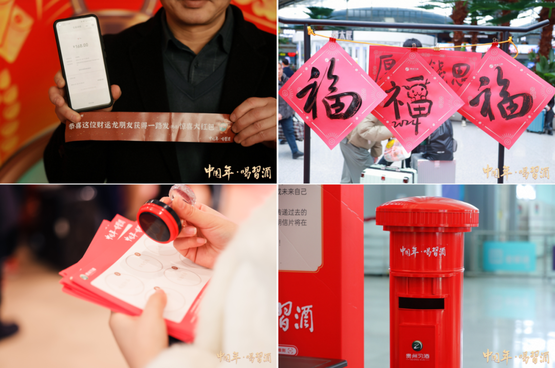 活动中,祝福红包、时光信箱、百福贺禧、互动秒拍等形式丰富的互动体验,吸引着众多归乡旅客们前来一一体验。同时,习酒也为前来体验的旅客准备了惊喜礼物,丰富的习酒文创周边不仅为旅客带来了惊喜与欢乐,也为高铁站增添浓厚的年味气息,在匆匆忙忙的归途中,人们得以暂时驻足,放松身心。