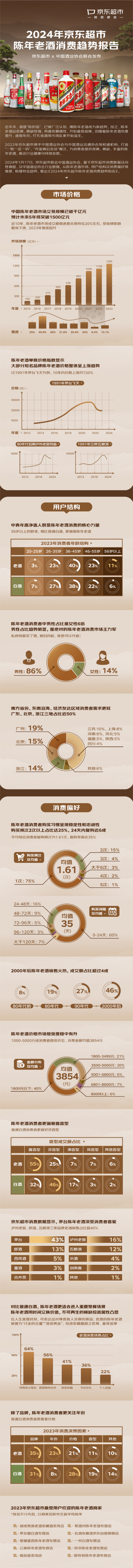 1月17日,京东超市联合中国酒业协会发布《2024年陈年老酒消费趋势报告》。根据京东超市消费数据、消费者问卷调查,报告发现十大特征:相比白酒,南方省份、56岁以上、男性消费者更偏爱陈年老酒。复购率高达35%。2000年以后生产的陈年老酒最抢手。
