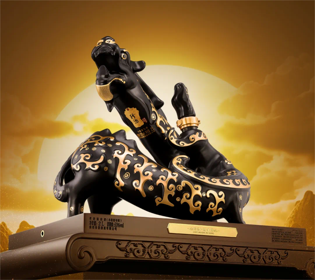 两款生肖酒的一大特点是艺术化造型,酒瓶用传统工艺美术技艺纯金描金勾勒而成,引入长江灵感,是用当代艺术语言再造“龙”,以此深刻触达消费者感受。