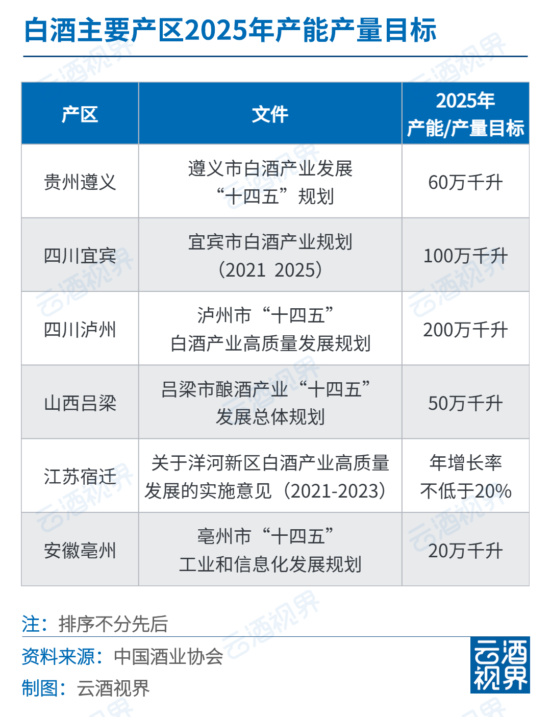 按照规划,到2025年,遵义、宜宾、泸州、吕梁、亳州五大产区的产能将超过430万千升。其中,仅宜宾、泸州产区的产能规划便达300万千升。