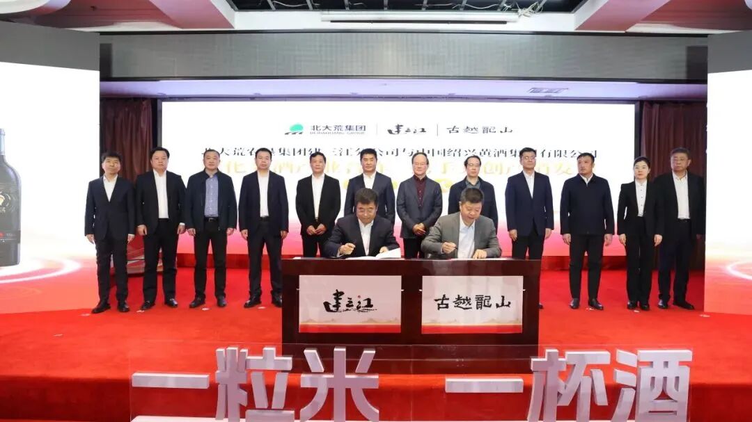 现场,古越龙山副总经理刘剑与建三江分公司党委委员、副总经理刘佳波在双方代表的见证下签署“一粒米一杯酒”共建共享战略合作协议。