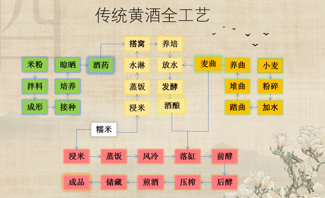 传统手工酿酒,是用自然培养多菌种酒药、麦曲,糖化发酵缓慢,发酵时间长,需要前发酵3-4天,后发酵90天培养才能压榨煎酒。
