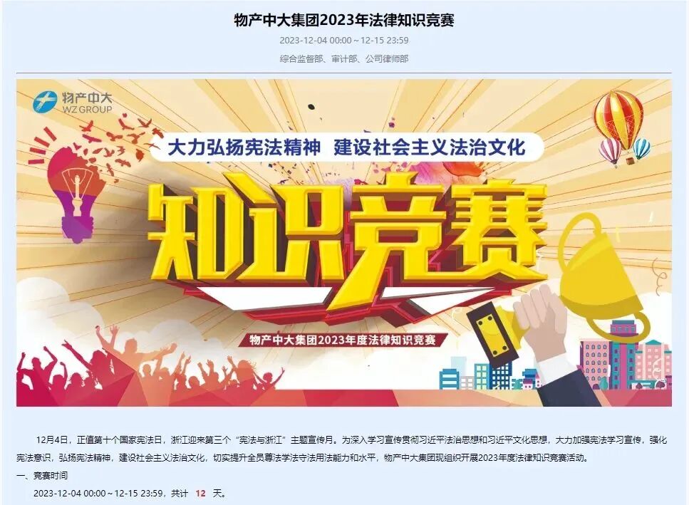 2023年12月是浙江第三个“宪法与浙江”主题宣传月,物产中大云商积极响应、主动参与,以丰富形式和多样视角开展了一系列宪法宣传活动,切实强化员工宪法意识,提升员工尊法、学法、守法、用法的综合素质和能力水平。