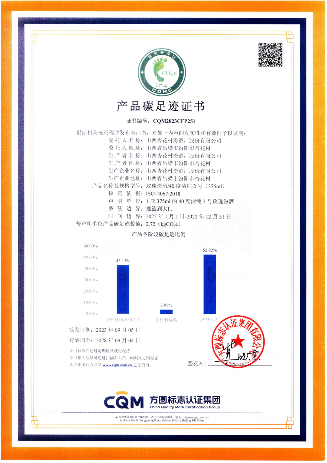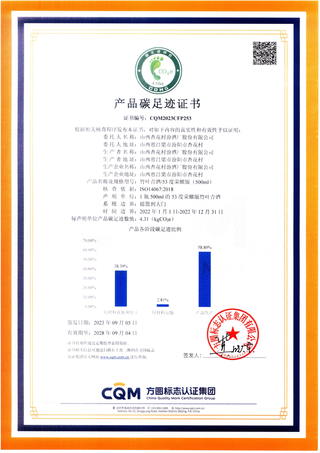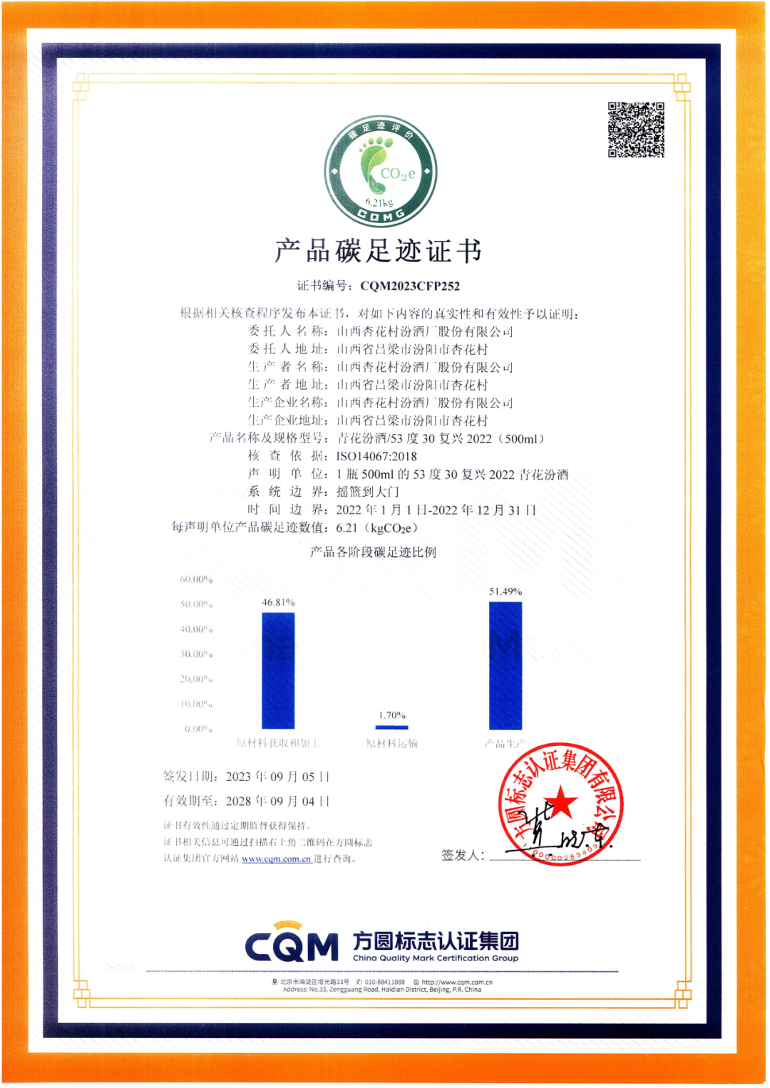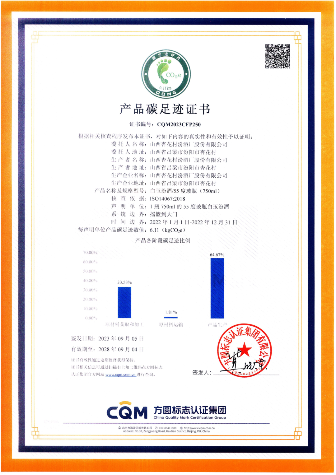 11月13日,《国家发展改革委等部门关于加快建立产品碳足迹管理体系的意见发布》,系统部署了产品碳足迹管理重点任务。汾酒超前谋划、提前部署,对照高标准、高要求开展先行先试,在本年度推进绿色工厂认证过程中,依据产品碳足迹国际标准ISO 14067:2018,围绕白酒原材料获取、运输到白酒生产等环节,通过对产品生命周期数据识别、监测、采集、核定和量化评价,汾酒、竹叶青酒等主线产品获得方圆产品碳足迹证书。