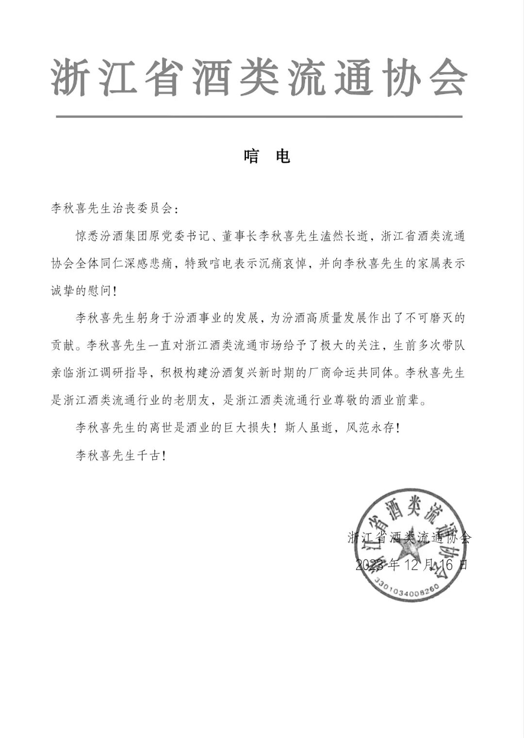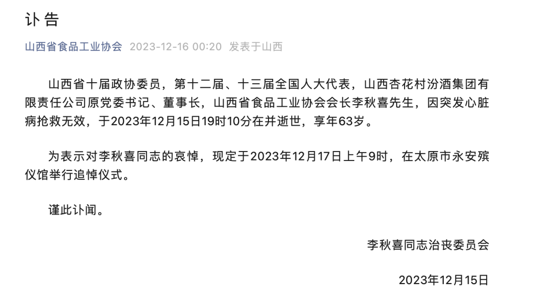 12月16日0时许,山西省食品工业协会在官方微信公众号发布讣告,山西省十届政协委员,第十二届、十三届全国人大代表,山西杏花村汾酒集团有限责任公司原党委书记、董事长,山西省食品工业协会会长李秋喜,因突发心脏病抢救无效,于2023年12月15日19时10分逝世,享年63岁。